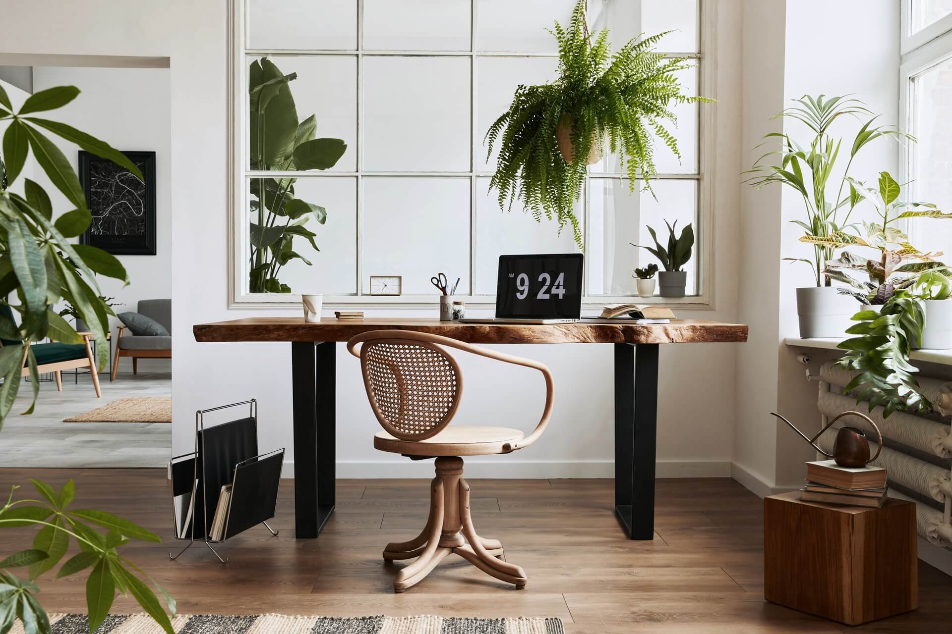 O paisagismo também é essencial. Plantas como zamioculcas, jiboias e lírios-da-paz trazem frescor e purificam o ar, além de estimularem a concentração.