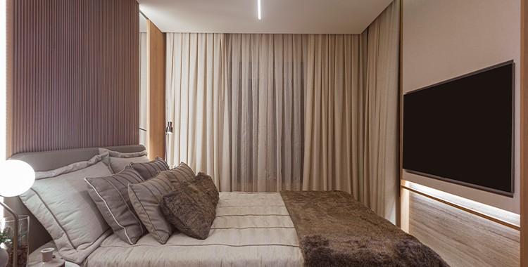Na decoração, esse tipo de cortina ajuda a criar ambientes mais elegantes e refinados, proporcionando fluidez e delicadeza, como neste apartamento decorado do Ária Higienópolis.