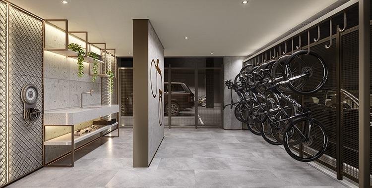 Um empreendimento com bicicletário, como o Ária Higienópolis, traz muita praticidade para o dia a dia dos usuários de bikes. Nesta perspectiva ilustrada é possível ver a estrutura projetada para facilitar o uso dos condôminos.